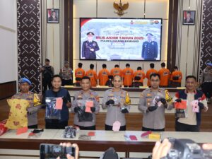 Tulang Bawang // Teropongbara.com tAkhir tahun ditutup dengan gebrakan besar. Polres Tulang Bawang menggelar Konferensi Pers Akhir Tahun 2025 yang mengungkap fakta mengejutkan: 153 kasus tindak pidana berhasil dibongkar sepanjang tahun oleh Sat Reskrim Polres Tulang Bawang bersama seluruh Polsek jajaran.Konferensi pers yang digelar pada Rabu, 31 Desember, ini menjadi panggung transparansi sekaligus peringatan keras bahwa hukum hadir dan bekerja nyata. Dari kasus pencurian, kekerasan, kejahatan terhadap anak, hingga korupsi dan kejahatan berbasis teknologi informasi, seluruhnya ditangani secara tegas dan profesional. “Ini bukan sekadar angka, ini adalah bukti nyata komitmen Polres Tulang Bawang dalam menjaga keamanan dan ketertiban masyarakat,” tegas Kapolres Tulang AKBP Yuliansyah, S.I.K, M.H., dalam keterangannya kepada awak media.Adapun rincian kasus yang berhasil diungkap antara lain 45 kasus pencurian dengan pemberatan (curat), 8 kasus pencurian dengan kekerasan (curas), 3 kasus pembunuhan, hingga 17 kasus persetubuhan terhadap anak dan 17 kasus KDRT. Tak hanya itu, Polres Tulang Bawang juga menindak kasus korupsi, penyalahgunaan senjata api, perjudian, penipuan, penggelapan, hingga kejahatan ITE yang kian marak di era digital.