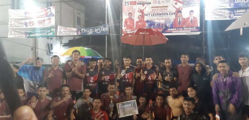 Aceh Jaya – Calon Wakil Bupati Aceh Jaya Muslem D menyerahkan langsung piala kepada pemain Tim bola Voli Lion Kuala Putra sebagai juara di turnamen Levendos Cup 2024, dalam rangka hut pemuda pante keutapang, Kecamatan Jaya, Kabupaten Aceh Jaya, Sabtu 5 Oktober 2024.