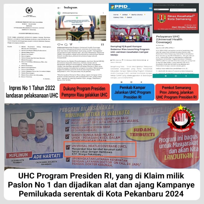 Serta salah satu pasangan Paslon didalam kampanyenya menyatakan Universal Health Coverage (UHC) merupakan programnya yang pro kepada masyarakat Pekanbaru, dan sudah dijalankan semasa dirinya menjabat sebagai Pejabat Walikota Pekanbaru, tanpa menyampaikan apakah program tersebut murni dari dirinya dan atau merupakan program dari Pemerintah pusat. Sebagaimana yang dinyatakan oleh dirinya (Paslon), dalam kampanya dialogisnya kepada masyarakat yang dilaksanakan pada Rabu (6/11/2024)