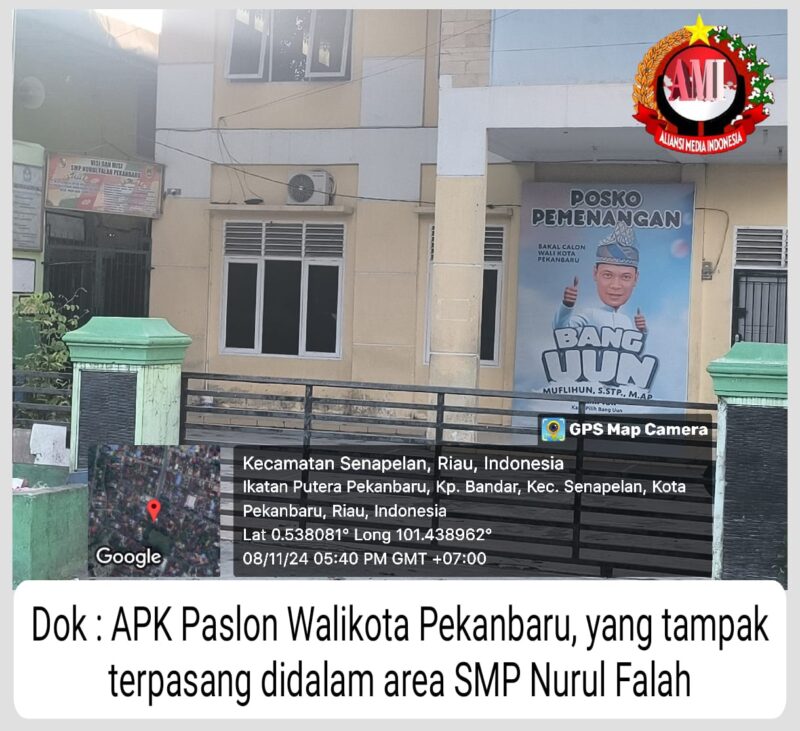 Berdasarkan informasi dan hasil investigasi dilapangan yang diperoleh awak media, dimana salah satu team Paslon Walikota Pekanbaru diduga memasang alat peraga Kampanye didalam area satuan pendidikan yang ada di Pekanbaru salah satunya di SMP Nurul Falah yang berlokasikan Jl Panglima Undan kecamatan Senapelan kota Pekanbaru.Jum’at (8/11/2024)