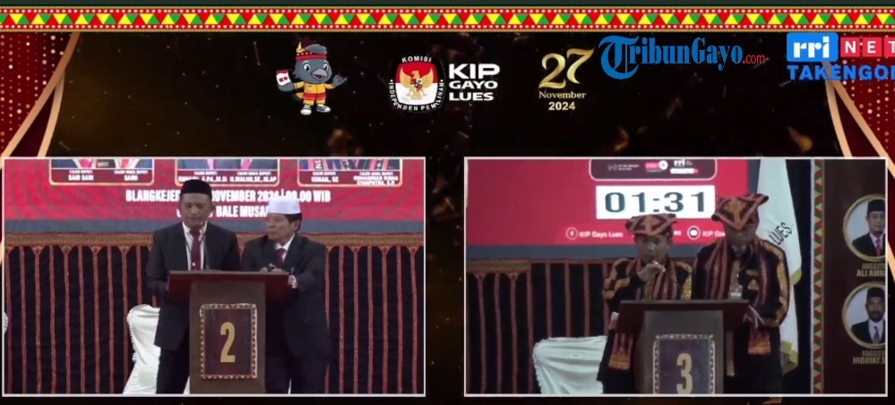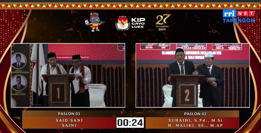 Gayo Lues – Komisi Independen Pemilihan (KIP) Kabupaten Gayo Lues menyelenggarakan Debat Publik Pertama Calon Bupati dan Wakil Bupati Gayo Lues dengan Tema Meningkatkan Pelayanan Publik untuk Pembangunan Ekonomi dan Kesejahteraan Rakyat yang Inklusif Bertempat di Bale Musara Kota Blangkejeren Gayo Lues, Senin (18/112024).