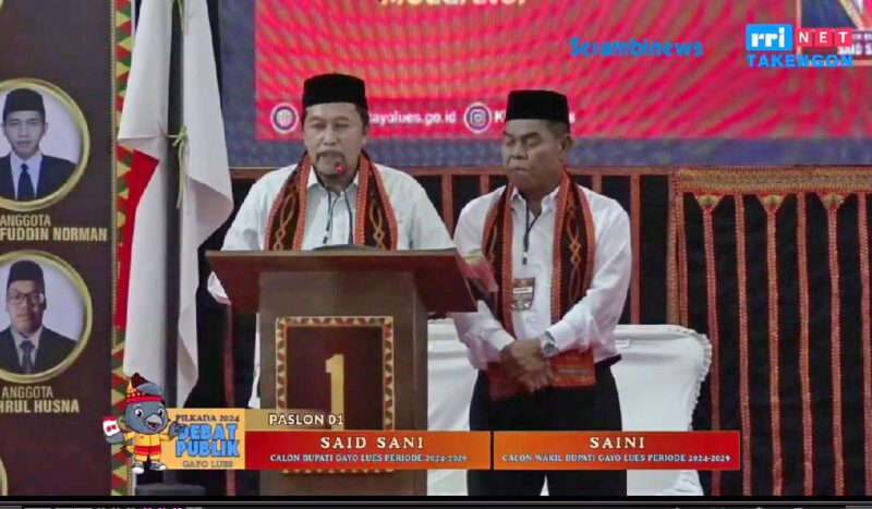 GAYO Lues | Calon Bupati Gayo Lues H.Said Sani dari Paslon Nomor 1 menjelaskan terkait masalah lahan yang dilontarkan Paslon No 2 pada saat Debat Pemilihan Kepala Daerah (Pilkada) Kabupaten Gayo Lues Provinsi Aceh, 2024 pada Senin (18/11/2024) di Bale Musara Blangkejeren Kabupaten Gayo Lues.