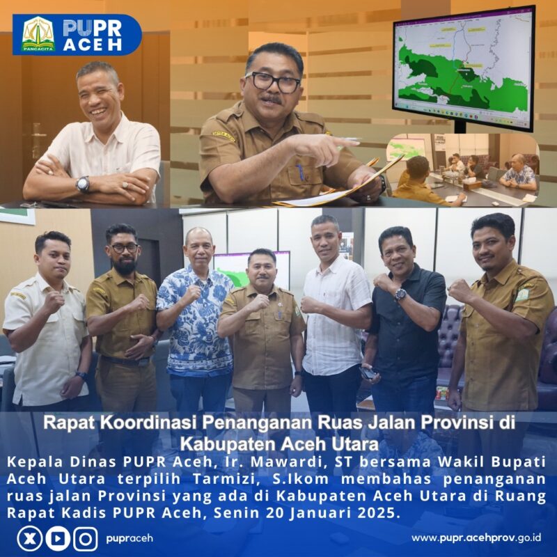 Banda Aceh – Kepala Dinas PUPR Aceh, Ir. Mawardi, S.T., bersama Wakil Bupati Aceh Utara terpilih, Tarmizi, S.I.Kom., menggelar rapat koordinasi terkait penanganan ruas jalan provinsi di Kabupaten Aceh Utara. Rapat tersebut berlangsung di ruang rapat Kepala Dinas PUPR Aceh, Senin (20/01/2025), dengan fokus pada percepatan pembangunan infrastruktur di wilayah tersebut.