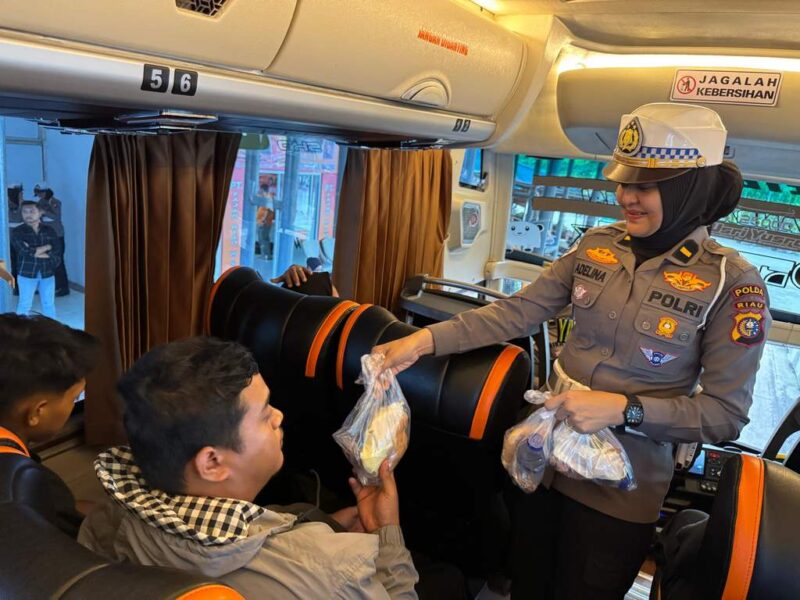 Pekanbaru — Ditlantas Polda Riau bersama Dinas Perhubungan, Bapenda, Jasa Raharja, serta Dealer Honda dan Yamaha menggelar kegiatan Ramadhan Berkah Berbagi Takjil di Terminal AKAP, Kecamatan Payung Sekaki. Dalam kegiatan ini, sebanyak 200 paket berbuka – berisi kolak, roti, kurma, dan air minum kemasan – dibagikan kepada penumpang bus, supir, dan kernet yang singgah di terminal.