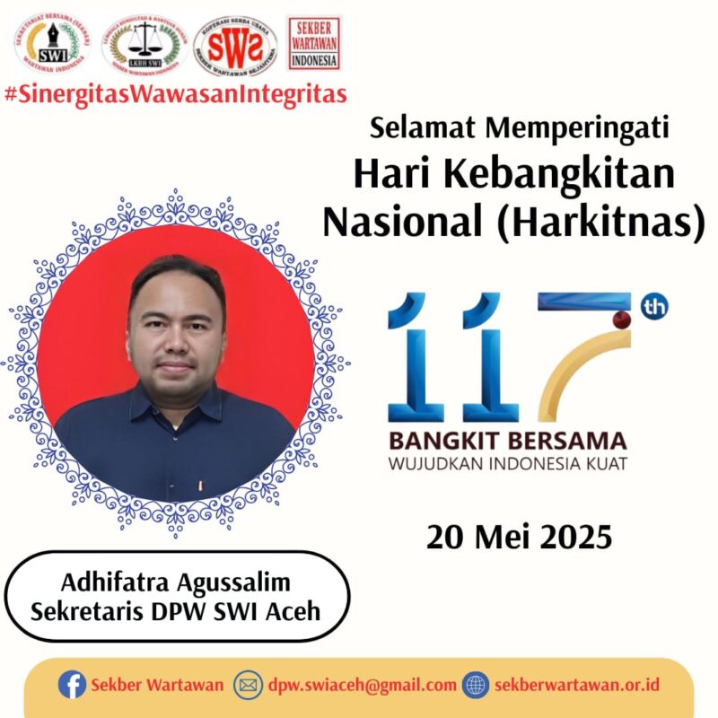 Banda Aceh, – Memperingati Hari Kebangkitan Nasional (Harkitnas) ke-117 yang jatuh pada 20 Mei 2025, Sekretaris Dewan Pimpinan Wilayah (DPW) Sekber Wartawan Indonesia (SWI) Aceh, Adhifatra Agussalim, CIP, CIAPA, CASP, CPAM, C.EML, mengajak seluruh masyarakat Aceh dan insan pers untuk menjadikan momen ini sebagai titik tolak kebangkitan bersama menuju Indonesia yang kuat, adil, dan bermartabat, Selasa (20/05/2025)