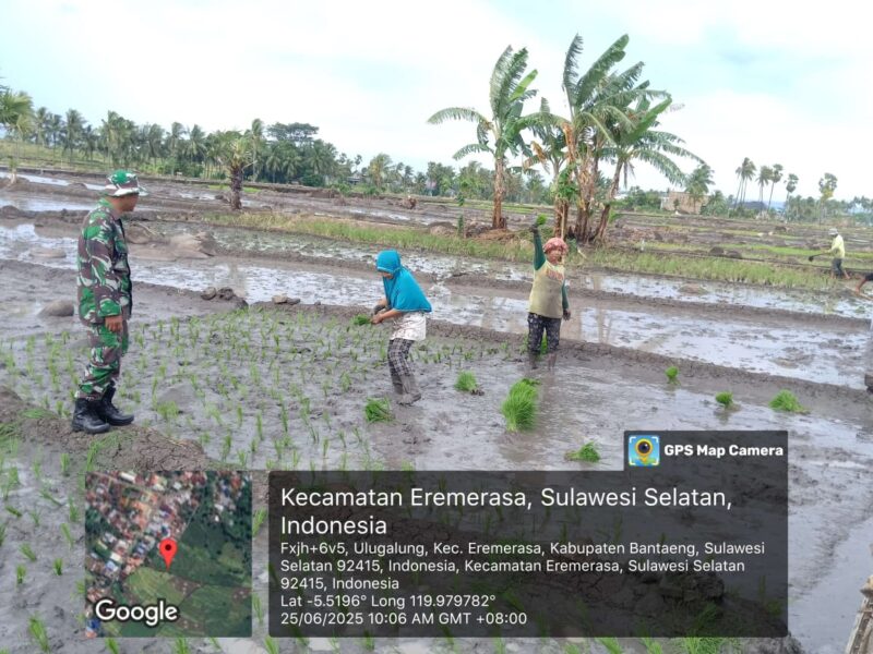 BANTAENG Teropong Barat.com, — Dalam rangka mendukung program ketahanan pangan nasional, Babinsa Desa Pabumbungan Koramil 1410-02/Eremerasa Kodim 1410/Bantaeng, Serda Basuki Rachmat, melaksanakan kegiatan pendampingan Luas Tambah Tanam (LTT) di area persawahan milik warga Desa Ulugalung, Kecamatan Eremerasa, Kabupaten Bantaeng, Rabu (25/6/2025).