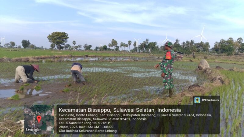 BANTAENG, Teropong Barat.com, – Dalam upaya mendukung program swasembada pangan nasional, Serka Abd Rahman, Babinsa Kelurahan Bonto Lebang Koramil 1410-01/Bissappu Kodim 1410/Bantaeng, melaksanakan kegiatan pendampingan dan pemantauan terhadap kelompok tani yang sedang melaksanakan kegiatan Luas Tambah Tanam (LTT) di wilayah binaannya. Sabtu 28 Juni 2025