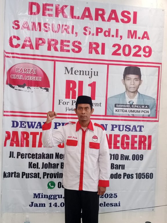 Jakarta, 27 April 2025 — Dewan Pimpinan Pusat Partai Cinta Negeri (DPP PCN) secara resmi menetapkan Ketua Umum Partai Cinta Negeri, Samsuri, S.Pd.I, M.A, sebagai Calon Presiden Republik Indonesia untuk Pemilihan Umum Presiden tahun 2029. Deklarasi tersebut disampaikan dalam sebuah acara resmi yang diselenggarakan pada hari Minggu, 27 April 2025, bertempat di Ruang Pertemuan DPP Partai Cinta Negeri, Jalan Percetakan Negara IV No.1, RT 010 RW 009, Kelurahan Johar Baru, Kecamatan Johar Baru, Jakarta Pusat, dimulai pukul 14.00 WIB hingga selesai.