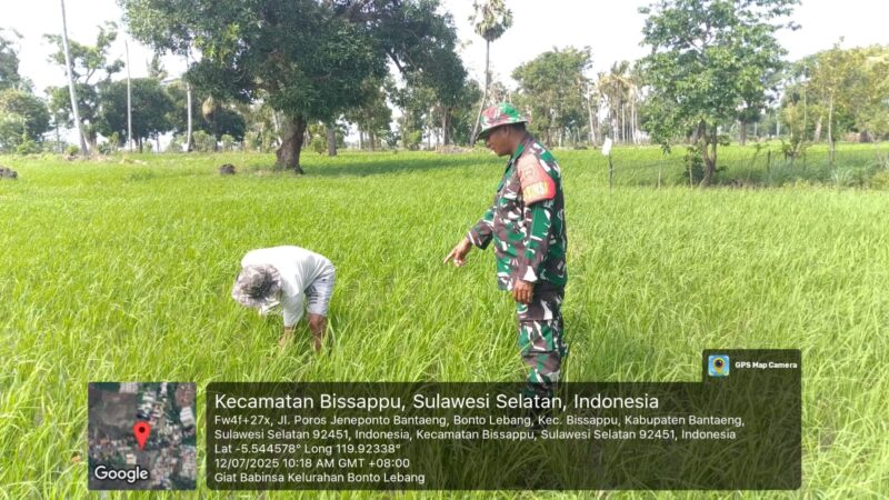BANTAENG Teropong Barat.com, – Dalam rangka mendukung program ketahanan pangan dan meningkatkan produktivitas pertanian di wilayah binaan, Serka Abd Rahman, Babinsa Kelurahan Bonto Lebang Koramil 1410-01/Bissappu Kodim 1410/Bantaeng, melaksanakan kegiatan pendampingan dan pemantauan terhadap kelompok tani yang tengah memasuki masa pemeliharaan tanaman, Sabtu, 12 Juli 2025.
