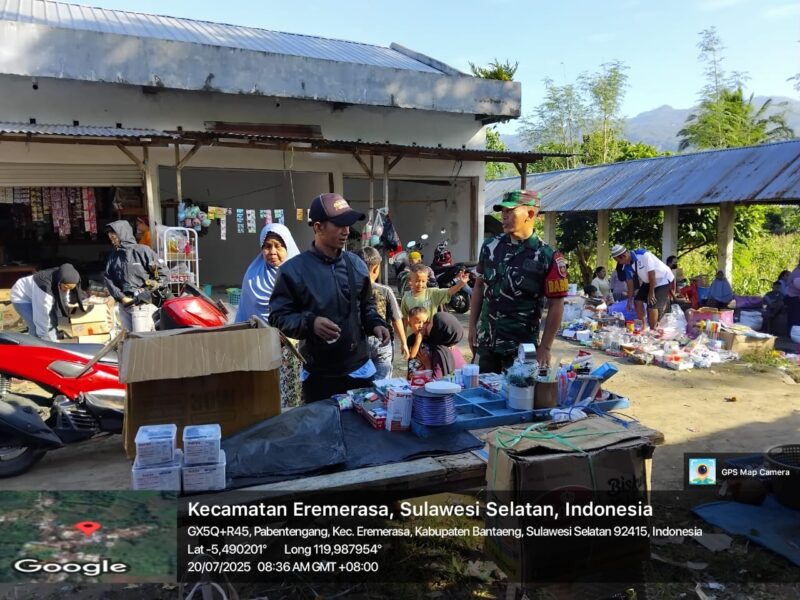 BANTAENG Teropong Barat.com, — Dalam rangka menjaga situasi keamanan dan ketertiban masyarakat di wilayah binaannya, Serda Ramli, Babinsa Desa Pa’bentengan Koramil 1410-02/Eremerasa Kodim 1410/Bantaeng, melaksanakan kegiatan pemantauan wilayah sekaligus memantau aktivitas masyarakat di pasar harian yang berlokasi di Dusun Parang, Desa Pa’bentengan, Kecamatan Eremerasa, Kabupaten Bantaeng, pada Minggu (20/07/2025).