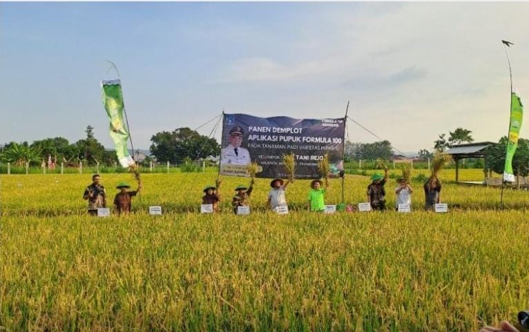 Ketua Kelompok Tani Tani Rejo, Gunari, menyampaikan rasa syukurnya karena penerapan pupuk Formula 100+ Serum Booster pada lahan demplot menghasilkan ubinan 4,9 kg atau setara 7,8 ton/ha, meningkat sekitar 16% dibanding hasil tahun sebelumnya yang hanya 6,7 ton/ha. Demplot dengan varietas padi Inpari 32 ini memiliki luas 2.300 m², dengan pemupukan dilakukan tiga kali pada umur 20 HST, 40 HST, dan 50 HST.