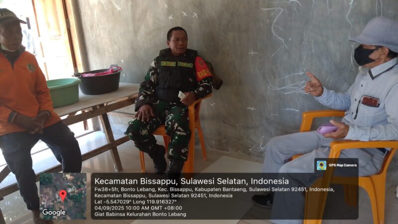 BANTAENG Teropong Barat.com, – Babinsa Kelurahan Bonto Lebang, Koramil 1410-01/Bissappu, Serka Abd. Rahman, melaksanakan komunikasi sosial (Komsos) bersama warga binaan di Kampung Beloparang, Kelurahan Bonto Lebang, Kecamatan Bissappu, Kabupaten Bantaeng. Kamis (04/09/2025).