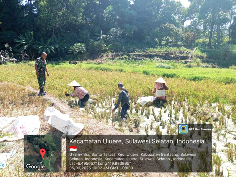 BANTAENG, Teropong Barat.com, – Babinsa Desa Bonto Tallasa, Koramil 1410-01/Bissappu, Sertu Junaedi, melaksanakan kegiatan pemantauan sekaligus pendampingan panen padi bersama para petani di Dusun Bulloe, Desa Bonto Tallasa, Kecamatan Uluere, Kabupaten Bantaeng. Jumat (5/9/2025).