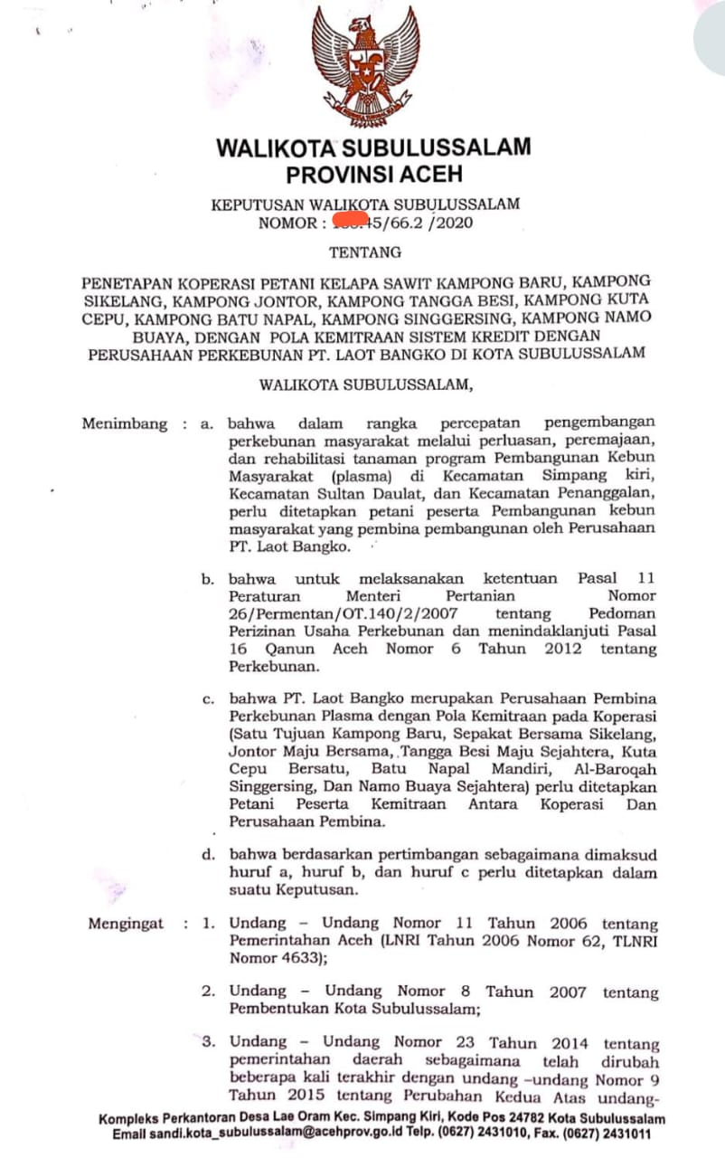 Investigasi mengungkap bahwa penetapan lahan plasma berdasarkan SK Walikota Subulussalam Nomor: 188.45/66.2/2020 memperlihatkan adanya data penerima yang tidak sesuai. Nama-nama dalam daftar plasma PT Laot Bangko dinilai menyimpang, bahkan ditengarai menguntungkan pihak tertentu. Sejumlah pejabat teras Pemko Subulussalam disebut ikut “memuluskan” prosedur penetapan lahan plasma yang sarat kontroversi.