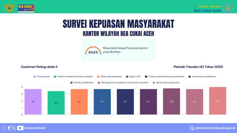 Banda Aceh (30/09/2025) — Kantor Wilayah Bea Cukai Aceh kembali menunjukkan konsistensi dalam memberikan pelayanan publik yang berkualitas. Berdasarkan hasil Survei Kepuasan Masyarakat (SKM) Triwulan III Tahun 2025, unit layanan ini mencatat Indeks Kepuasan Masyarakat (IKM) sebesar 93,2, dengan kategori “Sangat Baik”.
