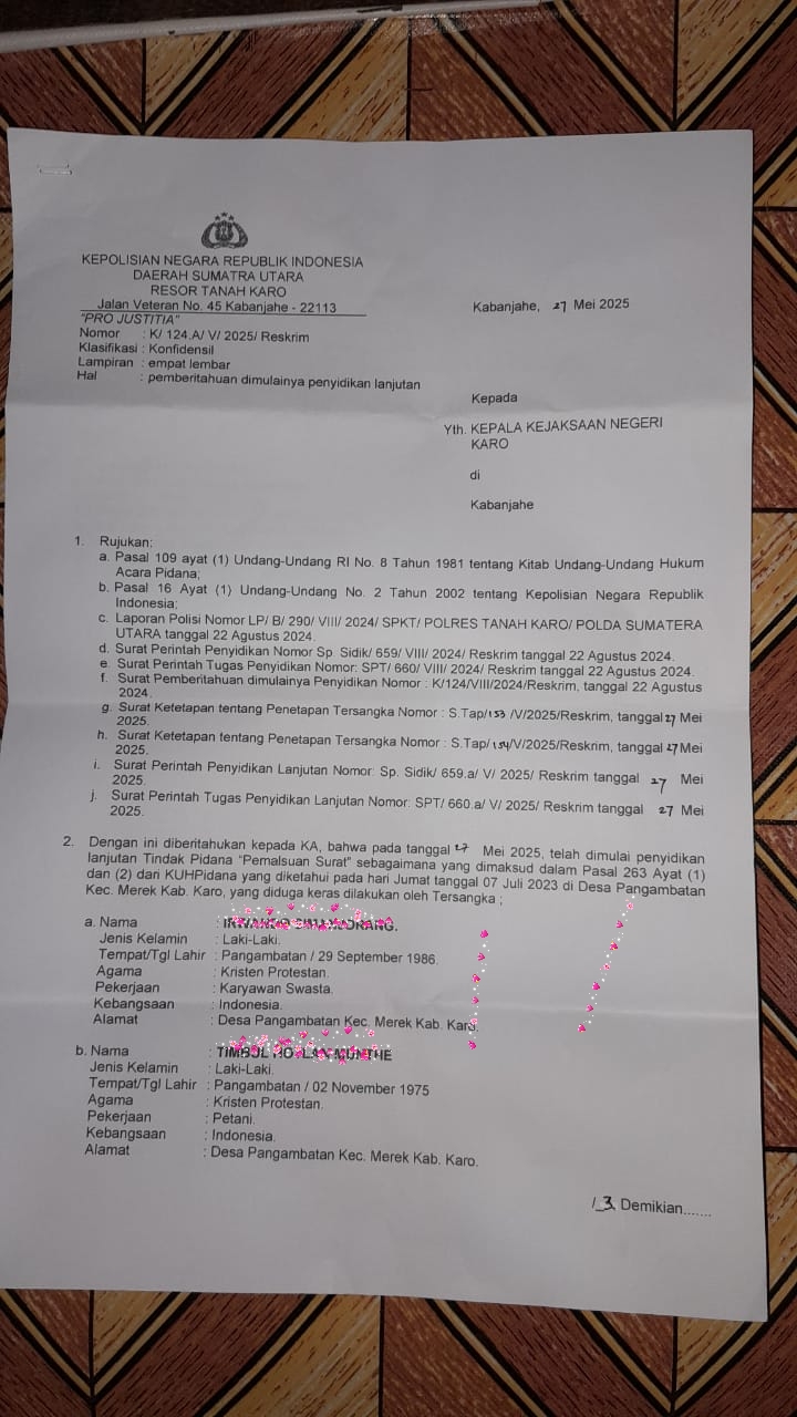 Penetapan status hukum tersebut disampaikan oleh Kepala Kejari Kabupaten Karo melalui Kepala Seksi Intelijen Dona Martinus Sebayang, SH. Dalam keterangannya, Sebayang menyebutkan bahwa kedua aparat desa itu dijerat dengan Pasal 236 Kitab Undang-Undang Hukum Pidana (KUHP) yang mengatur tentang tindak pidana pemalsuan dokumen. Apabila terbukti, pasal tersebut memiliki ancaman hukuman hingga enam tahun penjara.