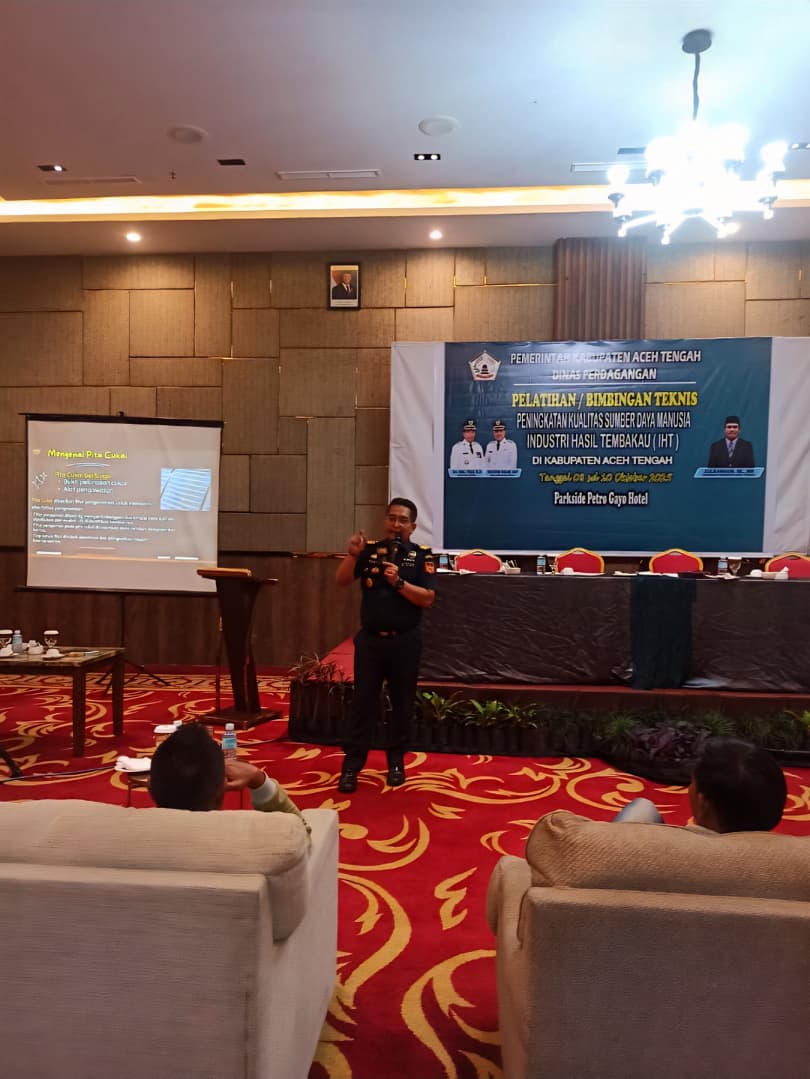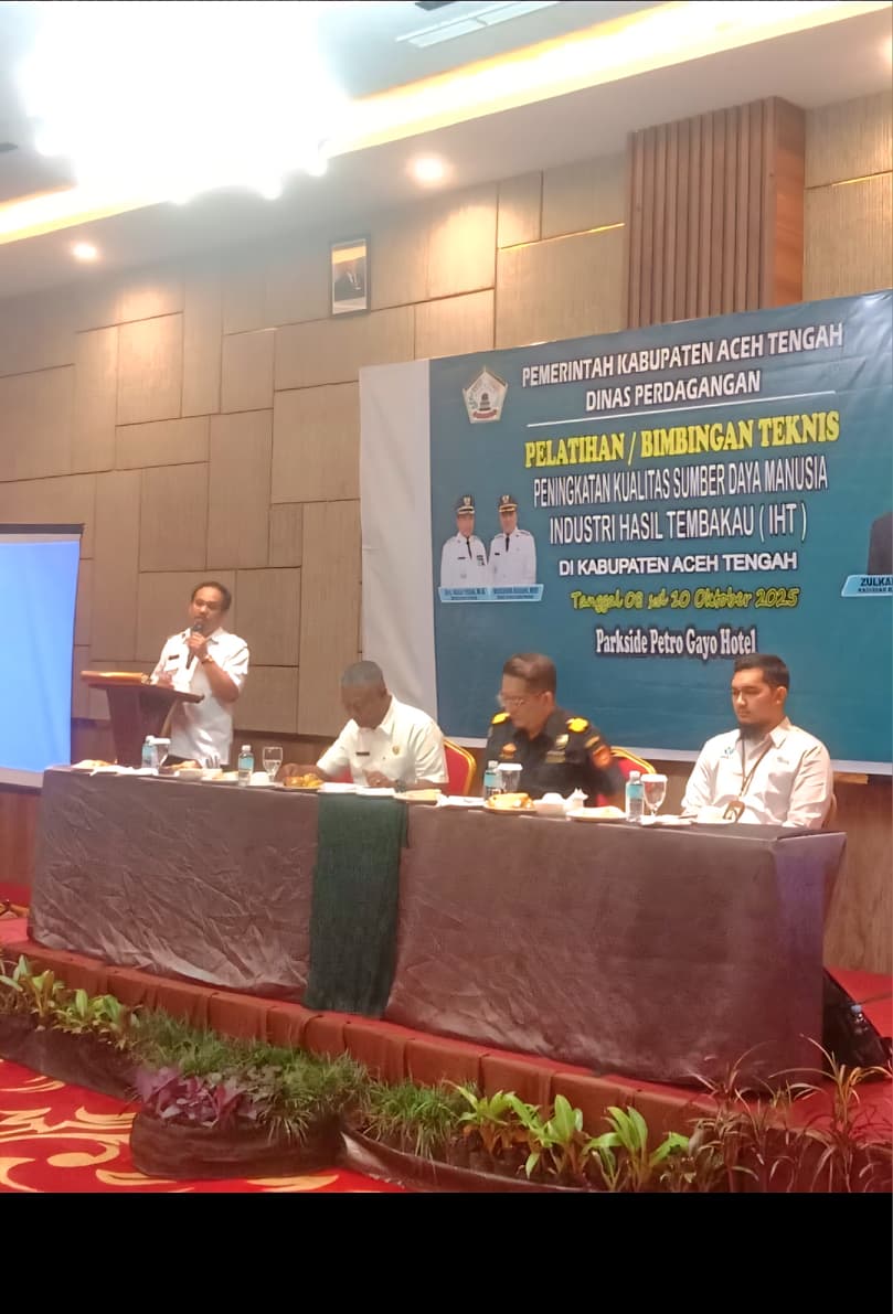 Takengon — Dinas Perdagangan Kabupaten Aceh Tengah bersama Bea Cukai Lhokseumawe menyelenggarakan Bimbingan Teknis (Bimtek) dan Pelatihan Peningkatan Kualitas Sumber Daya Manusia (SDM) Industri Hasil Tembakau selama dua hari, 8–9 Oktober 2025, di Nunang Hall Parkside Gayo Petro Hotel, Takengon.