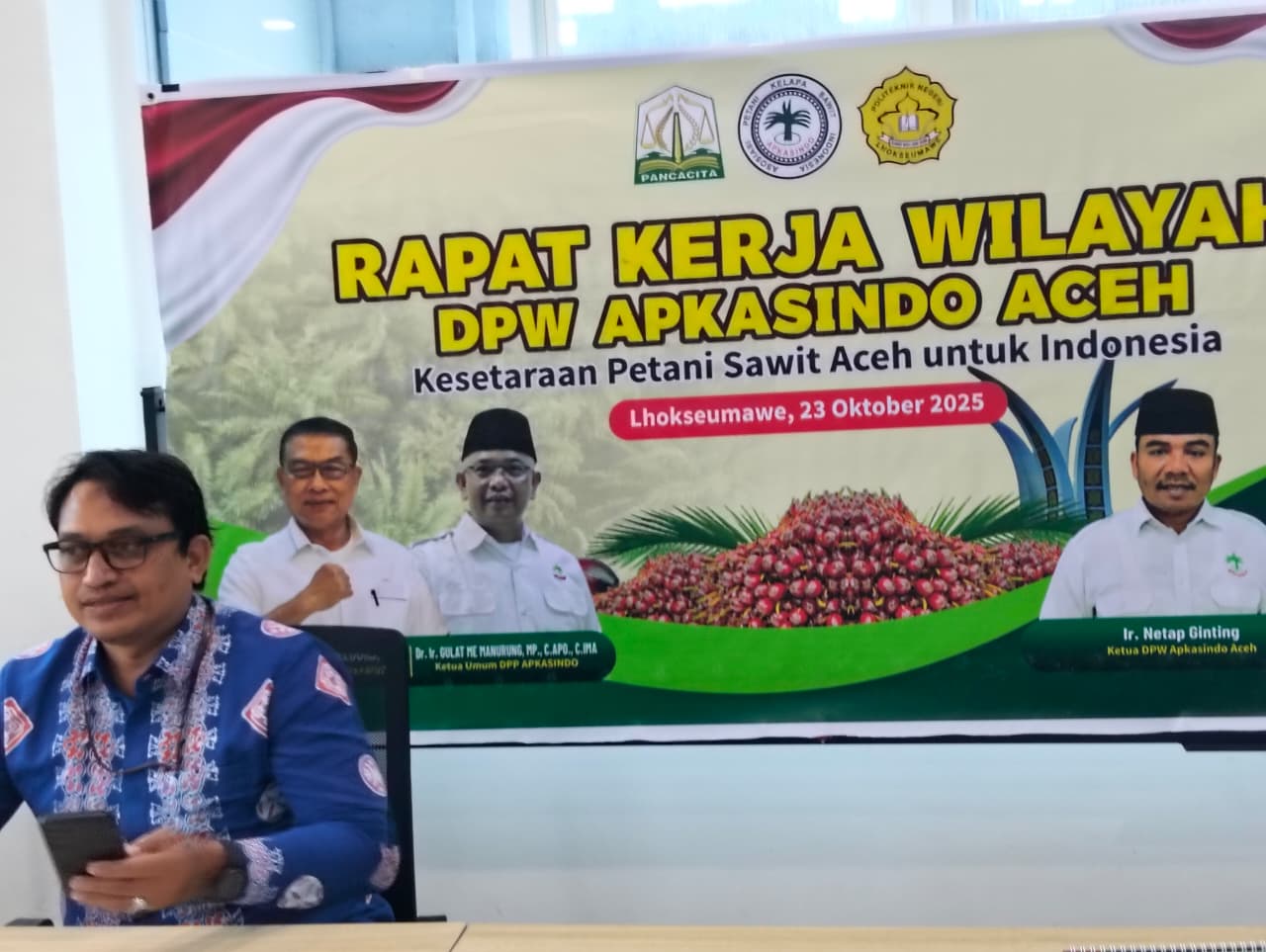 Lhokseumawe, teropongbarat.co. — Rapat Kerja Wilayah (Rakerwil) DPW Asosiasi Petani Kelapa Sawit Indonesia (Apkasindo) Aceh berlangsung hangat dan produktif di Lhokseumawe, Kamis (23/10/2025). Acara ini dibuka langsung oleh Ketua Umum DPP Apkasindo, Dr. Gulat M. Manurung, SP, MP, C.APO, C.IMA, dan menjadi momentum penting konsolidasi organisasi sekaligus refleksi peran Apkasindo dalam memperjuangkan nasib petani sawit di Tanah Rencong.