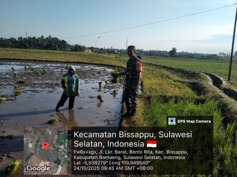 BANTAENG , Teropong Barat.com, – Dalam upaya mendukung ketahanan pangan di wilayah binaannya, Babinsa Kelurahan Bonto Rita, Koramil 1410-01/Bissappu, Serma Syamsuddin, melaksanakan kegiatan pendampingan Hanpangan (Luas Tambah Tanam) dengan memantau langsung aktivitas warga petani yang sedang menanam bibit padi.