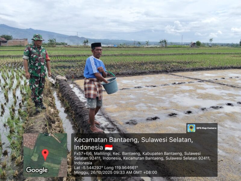 BANTAENG, Teropong Barat.com, — Babinsa Kelurahan Mallilingi, Koramil 1410-02/Eremerasa, Serda Akhmad Panisi, melaksanakan kegiatan pemantauan dan pendampingan terhadap warga binaan yang sedang menabur benih padi di Kampung Kalimbaung, Kelurahan Mallilingi, Kecamatan Bantaeng, Kabupaten Bantaeng. Minggu (26/10/2025)