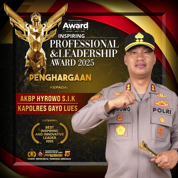 Gayo Lues — Kepala Kepolisian Resor Gayo Lues, AKBP Hyrowo, S.I.K., meraih penghargaan nasional bergengsi “Inspiring Professional & Leadership Award 2025” yang diselenggarakan oleh Indonesia Award Magazine. Anugerah ini diberikan sebagai apresiasi atas dedikasi kepemimpinan yang inovatif, inspiratif, dan berdampak positif dalam meningkatkan profesionalisme kepolisian serta pelayanan kepada masyarakat.