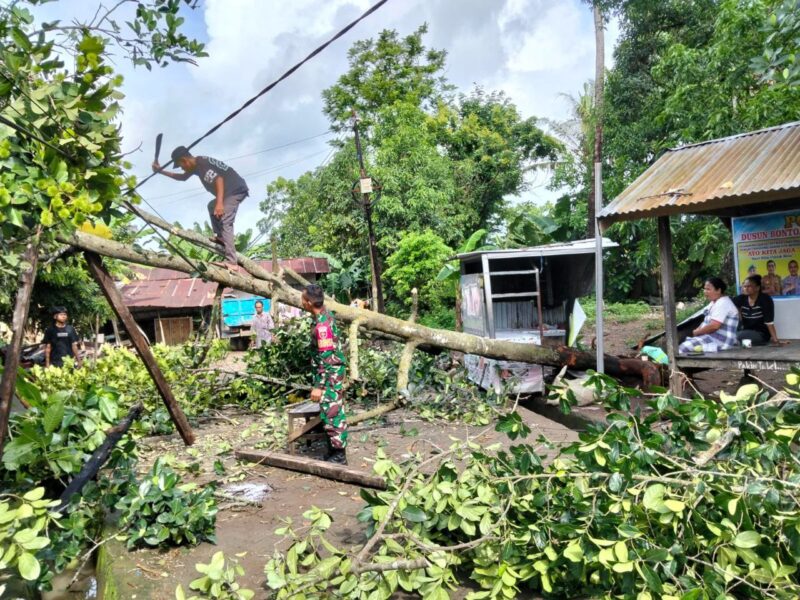TAKALAR – teropongbarat.com|Babinsa Koramil 1426-03/Galut Kodim 1426/Takalar Desa Bontokaddopepe Serda Sahrul bersama warga masyarakat bahu membahu membersihkan pohon yang tumbang menimpa kabel listrik dan telepon dan yang berlokasi di Desa Bontokaddopepe Kecamatan Galesong Utara Kabupaten Takalar, Sabtu (15/11/2025)