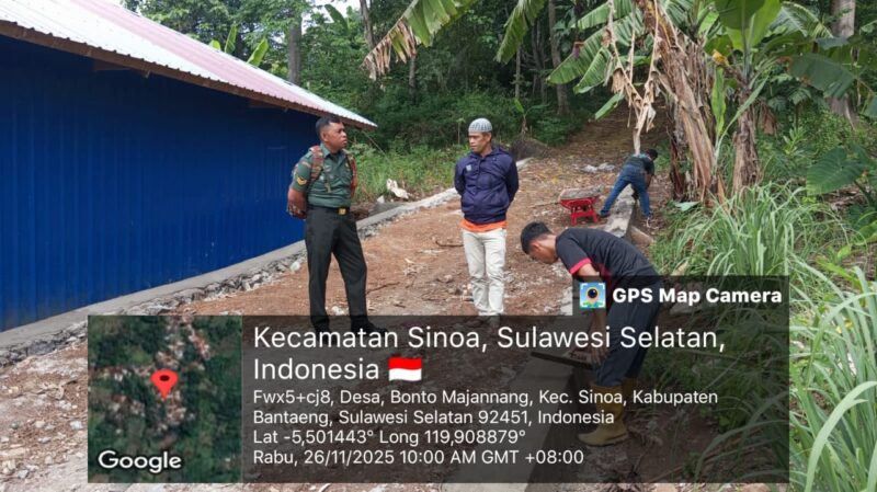 BANTAENG, Teropong Barat.com, – Babinsa Desa Bonto Majannang, Koramil 01/Bissappu Kodim 1410/Bantaeng, Sertu Safarudin, melaksanakan kegiatan komunikasi sosial (Komsos) bersama Kepala Desa sekaligus mendampingi pemantauan pekerjaan jalan tani yang tengah dikerjakan warga di Dusun Barua, Desa Bonto Majannang, Kecamatan Sinoa, Kabupaten Bantaeng. Rabu (26/11/2025).
