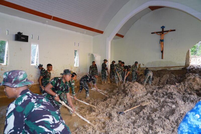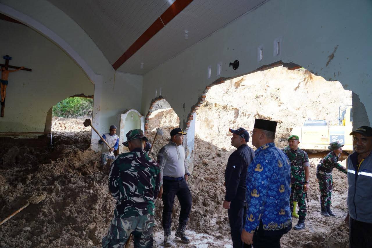 Mereka fokus membersihkan material longsor, memperbaiki bangunan terdampak, termasuk rumah ibadah yang ditargetkan segera dapat digunakan kembali.