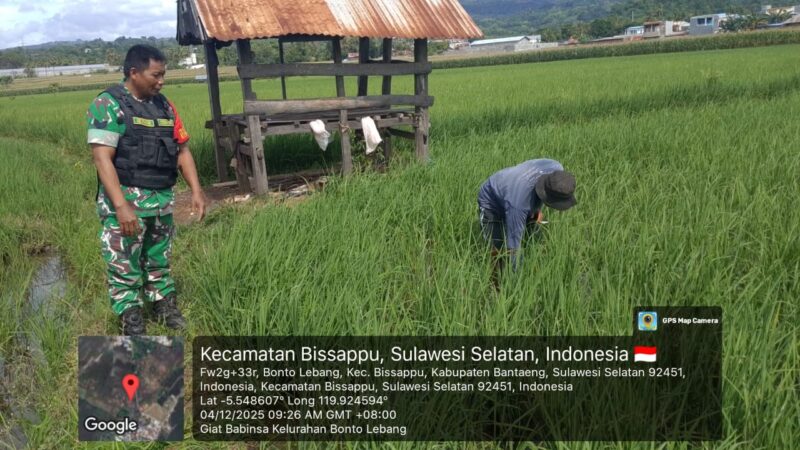 BANTAENG, Teropong Barat.com, — Babinsa Kelurahan Bonto Lebang, Koramil 01/Bissappu, Kodim 1410/Bantaeng, Serka Abd. Rahman, melaksanakan pendampingan serta pemantauan petani dalam kegiatan pemeliharaan padi pada program Luas Tambah Tanam (LTT) di Kampung Kaili, Kelurahan Bonto Lebang, Kecamatan Bissappu, Kabupaten Bantaeng, Kamis (4/12/2025).