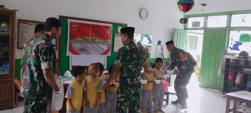 TAKALAR – teropongbarat.com|Personel Koramil 1426-07/Pattallassang, Kodim 1426/Takalar kembali melaksanakan kegiatan Jum’at berkah, membagikan paket nasi dus untuk para Siswa-siswi sekolah Taman Kanak-kanak Milenium Kirana di Kelurahan Bajeng, Kecamatan Pattallassang, Kabupaten Takalar. Jum’at, 19/12/2025.