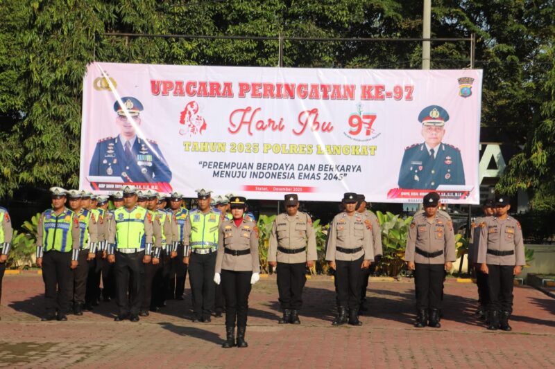 LANGKAT,Teropong Barat.com – Kepolisian Resor Langkat melaksanakan Upacara Peringatan ke-97 Hari Ibu Tahun 2025 dengan mengusung tema “Perempuan Berdaya dan Berkarya Menuju Indonesia Emas”. Upacara berlangsung khidmat di lapangan Jananuraga Mapolres Langkat dan dipimpin langsung oleh Kapolres Langkat AKBP David Triyo Prasojo S.H, S.I.K, M.Si, selaku Inspektur Upacara. Senin, (21/12/2025).