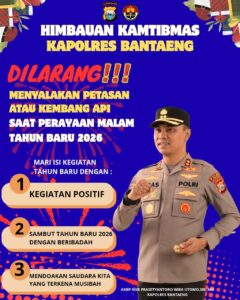 Kapolres Bantaeng berharap seluruh lapisan masyarakat dapat mematuhi himbauan tersebut demi terciptanya situasi yang aman, nyaman, dan kondusif selama perayaan malam Tahun Baru 2026 di wilayah Kabupaten Bantaeng.