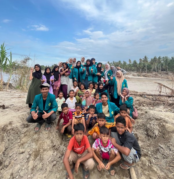 BIREUEN | Mahasiswa KKM Universitas Almuslim Peusangan melakukan pendampingan pemulihan trauma anak-anak Desa Blang Cut Kecamatan Peusangan Selatan pasca banjir, tanggal (27 Desember 2025).
