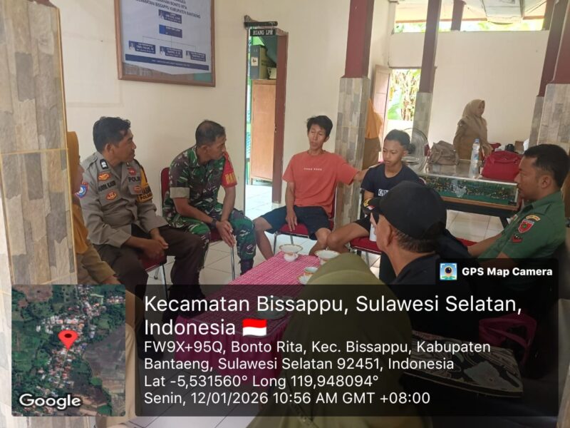 BANTAENG, Teropong Barat.com, – Babinsa Kelurahan Bonto Rita, Koramil 01/Bissappu, Kodim 1410/Bantaeng, Serma Syamsuddin, bersama Pilar Kelurahan Bonto Rita melaksanakan kegiatan komunikasi sosial (Komsos) dengan warga binaan. Kegiatan tersebut berlangsung di Kantor Kelurahan Bonto Rita, Kecamatan Bissappu, Kabupaten Bantaeng. Senin (12/01/2026)