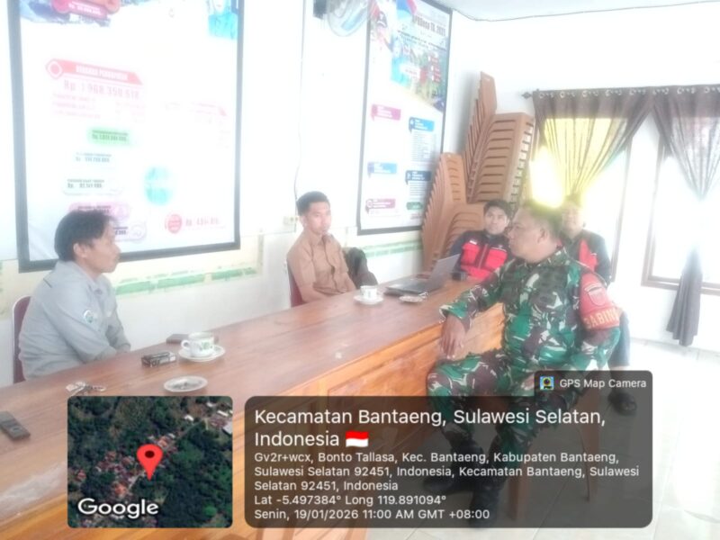 BANTAENG, Teropong Barat.com- Babinsa Desa Bonto Tallasa, Koramil 01/Bissappu, Kodim 1410/Bantaeng, Pelda Syafaruddin J., melaksanakan kegiatan komunikasi sosial (Komsos) bersama staf desa dan mahasiswa sebagai bentuk pembinaan teritorial di wilayah binaan. Kegiatan tersebut dilaksanakan di Kantor Desa Bonto Tallasa, Kecamatan Uluere, Kabupaten Bantaeng. Senin (19/01/2026)