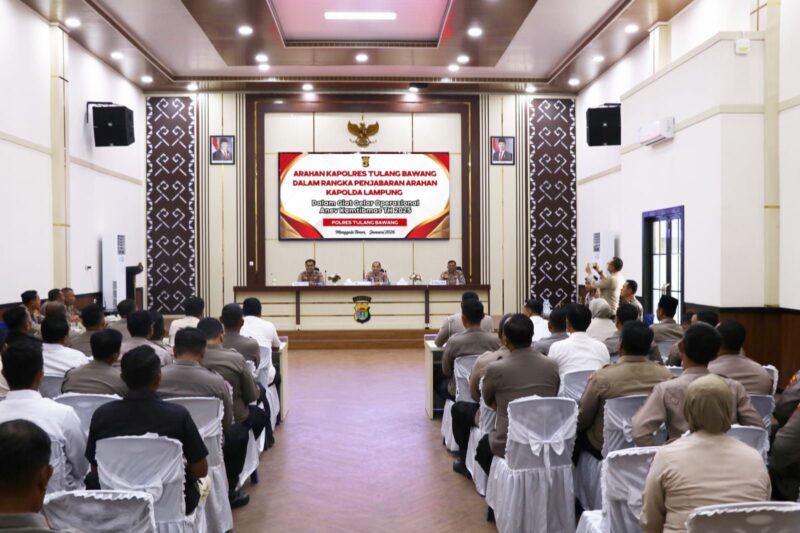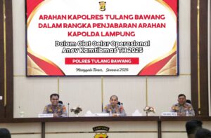 Tulang Bawang // Terpongbarat.com Komitmen Polri dalam menjaga stabilitas keamanan dan ketertiban masyarakat (kamtibmas) di wilayah Provinsi Lampung kembali ditegaskan. Kapolres Tulang Bawang, AKBP Yuliansyah, S.I.K., M.H., memimpin langsung kegiatan Analisis dan Evaluasi (Anev) Arahan Kapolda Lampung terkait Hasil Giat Go Anev Kamtibmas Tahun 2025, yang digelar di Aula Wira Satya Polres Tulang Bawang, Rabu (21/01/2026).Kegiatan strategis tersebut dihadiri oleh Wakapolres Tulang Bawang KOMPOL David Jackson Sianipar, S.I.K., para Pejabat Utama (PJU), perwira, para Kapolsek jajaran, serta ASN Polres Tulang Bawang. Anev ini menjadi langkah konkret Polres Tulang Bawang dalam menindaklanjuti arahan Kapolda Lampung guna memastikan pelaksanaan tugas kepolisian berjalan optimal, profesional, dan presisi.Dalam arahannya, Kapolres Tulang Bawang menekankan pentingnya soliditas internal dan kesiapsiagaan seluruh personel dalam menghadapi dinamika kamtibmas ke depan. “Arahan Bapak Kapolda Lampung merupakan pedoman dan atensi utama bagi kita semua. Seluruh jajaran Polres Tulang Bawang wajib melaksanakan tugas dengan penuh tanggung jawab, meningkatkan pelayanan kepada masyarakat, serta menjaga situasi kamtibmas yang aman dan kondusif sepanjang tahun 2025,” tegas AKBP Yuliansyah.Kapolres juga menekankan agar setiap satuan kerja dan Polsek jajaran mampu melakukan evaluasi menyeluruh terhadap kinerja yang telah dilaksanakan, sekaligus menyusun langkah-langkah strategis guna mengantisipasi potensi gangguan keamanan di wilayah hukum Polres Tulang Bawang.
