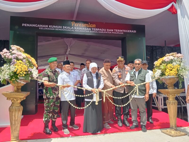 PASURUAN//teropongbarat.com Komandan Kodim 0819/Pasuruan, Letkol Inf Boga Bramiko, M.Han., menghadiri kegiatan Peresmian Penanganan Kawasan Kumuh Skala Kawasan Terpadu dan Terintegritasi yang berlokasi di Kelurahan Bendomungal, Kecamatan Bangil, Kabupaten Pasuruan, Jawa Timur, Rabu (21/01/2026). Peresmian tersebut secara langsung dilakukan oleh Gubernur Jawa Timur Khofifah Indar Parawansa dan dipusatkan di kawasan Makam Al Habib Abdullah Bin Ali Al Hada, Kelurahan Bendomungal. Kegiatan ini menjadi bagian dari komitmen Pemerintah Provinsi Jawa Timur dalam mewujudkan lingkungan permukiman yang layak, sehat, dan berkelanjutan.Dalam sambutannya, Gubernur Khofifah Indar Parawansa menyampaikan apresiasi serta ucapan selamat atas terlaksananya program penanganan kawasan kumuh yang terintegrasi tersebut. Ia menjelaskan bahwa program ini merupakan salah satu pilot project penanganan kawasan kumuh yang berada dalam kewenangan Pemerintah Provinsi Jawa Timur dan dilaksanakan melalui sinergi dengan Pemerintah Kabupaten Pasuruan.“Penanganan kawasan kumuh ini dilaksanakan secara terpadu dan terintegrasi dengan melibatkan berbagai sektor, sehingga hasilnya dapat dirasakan langsung oleh masyarakat,” ujar Khofifah. Adapun penanganan yang dilakukan meliputi peningkatan fungsi infrastruktur permukiman, seperti pembangunan dan perbaikan jalan lingkungan, sistem drainase, sanitasi, penyediaan air bersih, pengelolaan sampah, serta renovasi Rumah Tidak Layak Huni (RTLH). Gubernur juga berharap masyarakat dapat bersama-sama menjaga dan merawat kawasan tersebut agar tetap bersih, nyaman, dan berkelanjutan.