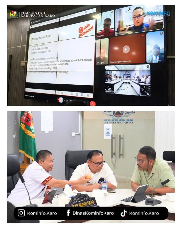 Karo.|  Bupati Karo, Brigjen Pol (Purn) Dr. dr. Antonius Ginting, Sp.OG., M.Kes., Wakil Bupati Karo, Komando Tarigan, SP., dan Sekretaris Daerah Kabupaten Karo, Gelora Kurnia Putra Ginting, S.STP., MM., bersama OPD terkait dan APINDO mengikuti rapat pembahasan hilirisasi jeruk dengan pemanfaatan teknologi Smart Cold Storage System yang dilaksanakan secara Zoom Meeting bersama MFA INSIGHTS Singapore, bertempat di Ruang KCC Kantor Bupati Karo, pada Rabu (28/01/2026).