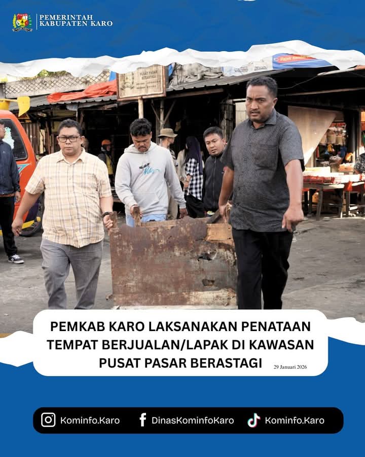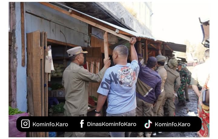 KARO | Pemerintah Kabupaten Karo melaksanakan kegiatan penataan tempat berjualan/lapak bagi pedagang yang menempati lokasi tidak sesuai dengan peruntukan yang telah ditetapkan di kawasan Pusat Pasar Berastagi, Kamis (29/01/2026).