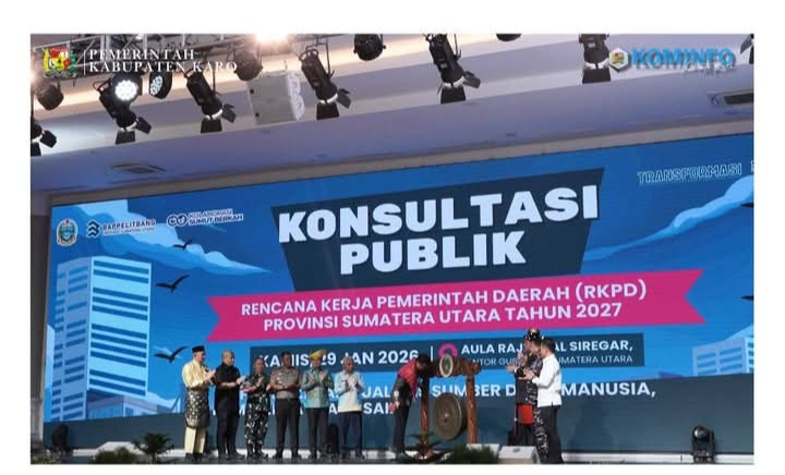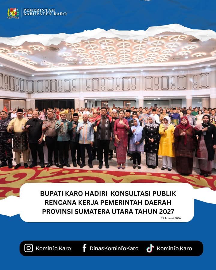MEDAN – Bupati Karo, Brigjen Pol (Purn) Dr. dr. Antonius Ginting, Sp.OG., M.Kes., menghadiri Konsultasi Publik Rencana Kerja Pemerintah Daerah (RKPD) Provinsi Sumatera Utara Tahun 2027 yang dibuka oleh Gubernur Sumatera Utara, Muhammad Bobby Afif Nasution, di Aula Tengku Rizal Nurdin, Kantor Gubernur Sumatera Utara, pada Kamis (29/01/2026).