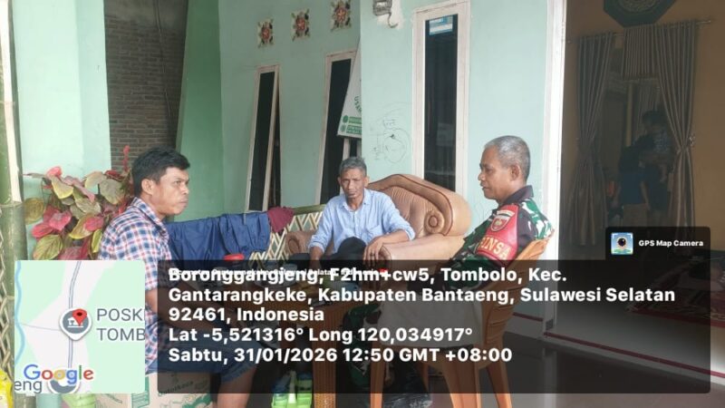 BANTAENG, Teropong Barat.com, – Babinsa Desa Tombolo, Koramil 1410-03/Tompobulu, Kodim 1410/Bantaeng, Sertu Abdul Azis, melaksanakan kegiatan Komunikasi Sosial (Komsos) bersama masyarakat. Kegiatan ini merupakan bagian dari tugas pembinaan teritorial Babinsa dalam rangka mempererat hubungan silaturahmi dengan warga binaan. kegiatan Tersebut berlangsung di Desa Tombolo, Kecamatan Gantarang Keke, Kabupaten Bantaeng. Sabtu 31/01/2026