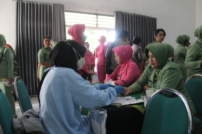 Terpongnarat.com Dalam rangka memperingati Hari Ulang Tahun (HUT) ke-80 Persit Kartika Chandra Kirana (KCK), Persit KCK Cabang XXXIII Kodim Pasuruan Koorcab Rem 083 PD V/Brawijaya menggelar kegiatan bakti sosial berupa donor darah serta pemberian bantuan sosial (bansos), bertempat di Makodim 0819 Pasuruan. Jumat (06/02/26).Kegiatan kemanusiaan tersebut diikuti oleh ibu Persit, personel TNI, Polri, anggota Bhayangkari, PNS TNI, Warakawuri, anggota Pramuka serta masyarakat sekitar. Selain sebagai rangkaian peringatan HUT Persit, kegiatan ini juga menjadi wujud kepedulian sosial terhadap sesama, khususnya dalam membantu ketersediaan stok darah di wilayah Pasuruan.