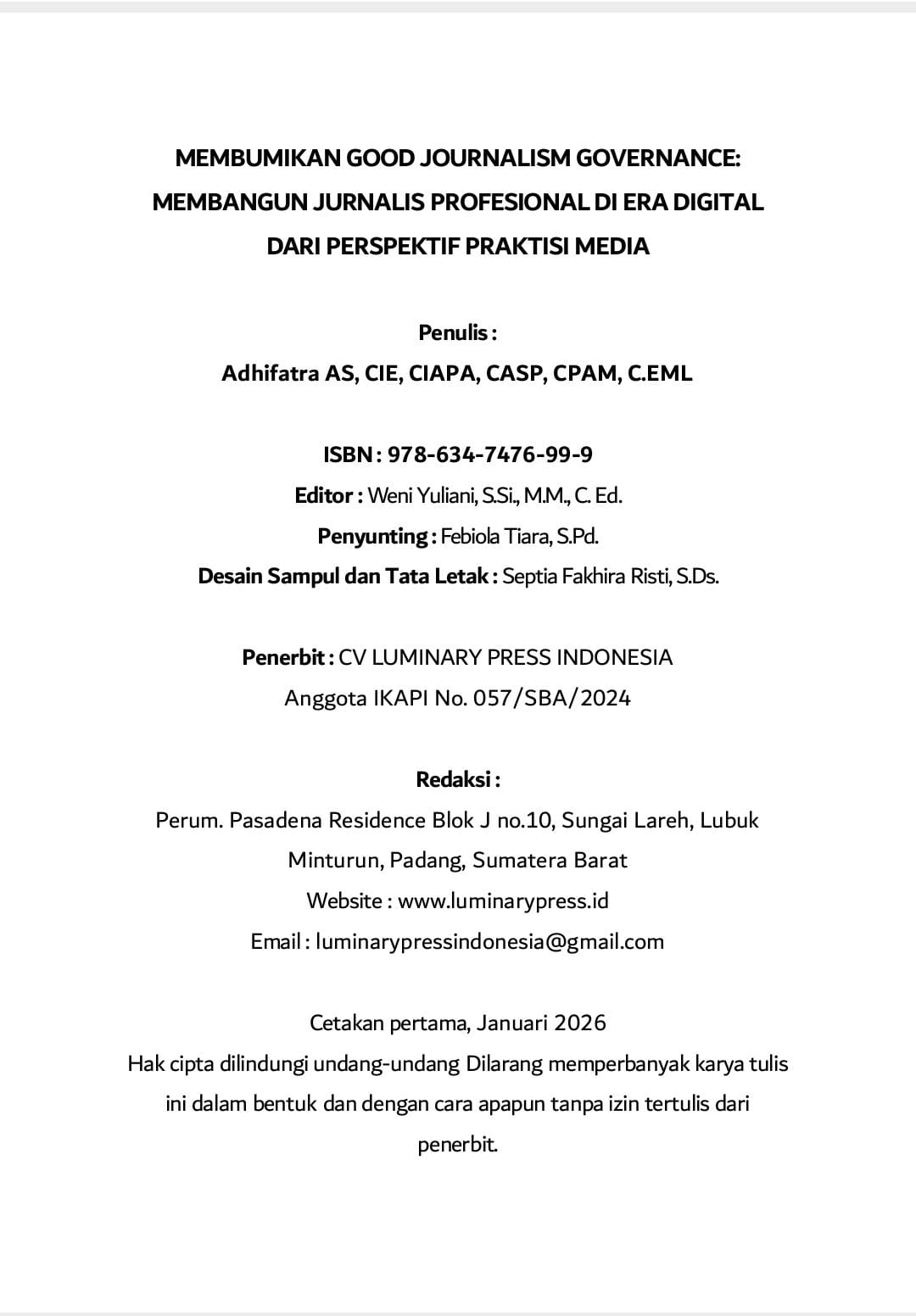 “Saya menulis buku ini sebagai bentuk tanggung jawab moral untuk ikut menjaga marwah profesi wartawan. Media harus menjadi ruang edukasi, bukan sekadar sarana sensasi,” tutur Adhifatra, Kamis (12/02/2026).