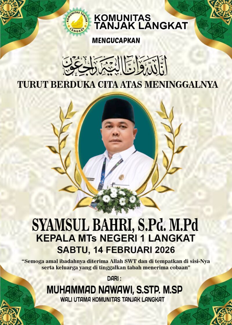 Sosok pendidik berdedikasi, Syamsul Bahri, yang menjabat sebagai Kepala Madrasah Tsanawiyah Negeri (MTsN) 1 Langkat, mengembuskan napas terakhirnya di Rumah Sakit Putri Bidadari pada Sabtu sore (14/2/2026)