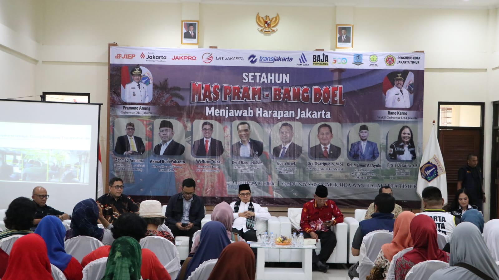 Jakarta – Kegiatan “Setahun Mas Pram – Bang Doel Menjawab Harapan Jakarta” yang digelar di Gedung Sanggar Krida Wanita, Rawamangun, Jakarta Timur, pada 13 Februari 2026, berlangsung semarak dan penuh antusiasme. Forum refleksi tersebut menjadi ruang silaturahmi sekaligus dialog terbuka antara pemerintah dan masyarakat, serta dihadiri sejumlah tokoh penting dari unsur pemerintahan, legislatif, BUMD, organisasi keagamaan, kepemudaan, hingga lembaga riset.