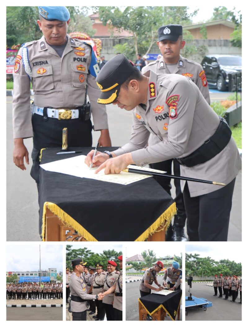Kasatreskrim Pejabat Lama AKBP Awaludin Kanur, S.I.K.,M.H., diserahterimakan kepada Pejabat Baru AKBP Parikhesit, S.H.,S.I.K.,M.H. Kasatresnarkoba Pejabat Lama Kompol Rihold, S.Kom., S.I.K., M.H., diserahterimakan kepada Pejabat Baru Kompol Arnold Julius Simanjuntak, S.E., S.I.K. Kasium Pejabat Lama Kompol Susida Aswita, S.SOS., M.M., diserahterimakan kepada Pejabat Baru Kompol Hadi Wiyono, S.IP.Kapolsek Ciledug Pejabat Lama Kompol R.A. Dalby, M.H., diserahterimakan kepada Pejabat Baru Kompol Susida Aswita, S.SOS., M.M. Kapolsek Karawaci Pejabat Lama Kompol Hadi Wiyono, S.IP., diserahterimakan kepada Pejabat Baru Kompol Ajie Perkasa, S.I.K.,M.I.K. Kapolsek Teluknaga pejabat Lama AKP Nanda Satya Pratama Baso, S.T.K.,S.I.K., diserahterimakan kepada Pejabat Baru Iptu Kevin Hotlando, S.Tr.K.,S.I.K. Kapolsek Pakuhaji Pejabat Lama AKP Rokhmatulloh, S.H., diserahterimakan kepada Pejabat Baru AKP Prapto Lasono, S.H., M.H. Pergantian ini merupakan bagian dari dinamika organisasi dan penyegaran di tubuh Polri.Dalam amanatnya, Kapolres Metro Tangerang Kota Kombes Pol. Dr. Raden Muhammad Jauhari menegaskan bahwa rotasi jabatan adalah hal yang wajar dalam organisasi untuk meningkatkan kinerja dan pelayanan kepada masyarakat. “Serah terima jabatan ini merupakan bagian dari penyegaran dan pembinaan karier personel. Saya berharap pejabat yang baru dapat segera menyesuaikan diri, memahami karakter wilayah, serta meningkatkan pelayanan kepada masyarakat secara profesional dan humanis,” ujar Kombes Jauhari.Ia juga menyampaikan apresiasi kepada pejabat lama atas dedikasi dan pengabdiannya selama bertugas di Polres Metro Tangerang Kota. “Terima kasih kepada pejabat lama atas kontribusi dan kerja kerasnya. Semoga pengalaman yang didapat bisa menjadi bekal di tempat tugas yang baru,” tambahnya. Rangkaian upacara berlangsung khidmat, mulai dari pembacaan surat keputusan, pengambilan sumpah jabatan, penandatanganan berita acara sertijab dan pakta integritas, hingga doa bersama. Kegiatan dilanjutkan dengan penyerahan cinderamata serta ramah tamah. Dengan adanya rotasi ini, diharapkan soliditas dan kinerja Polres Metro Tangerang Kota semakin meningkat dalam menjaga keamanan dan ketertiban masyarakat di wilayah hukumnya.