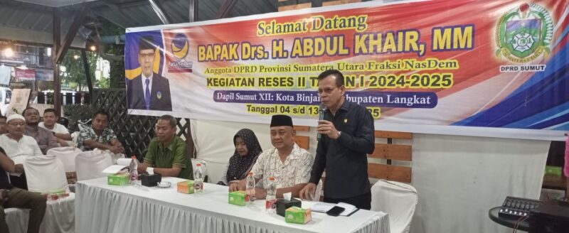 LANGKAT, Teropong Barat.com | Abdul Khair selaku anggota Komisi( A ) DPRD Provinsi Sumatra Utara fraksi Nasdem lakukan Reses masa sidang 2 Tahun 2025 dengan dialog tanya – jawab seputar keluhan masyarakat dengan sambutan meriah bertempat di ROT Coffee, Jalan Lintas Medan – Banda Aceh Kelurahan Perdamaian Stabat,Kamis (6/3/2025) pukul 18.00 – 19.00 wib