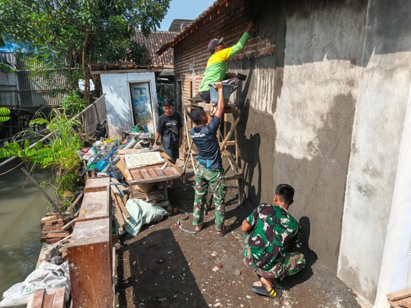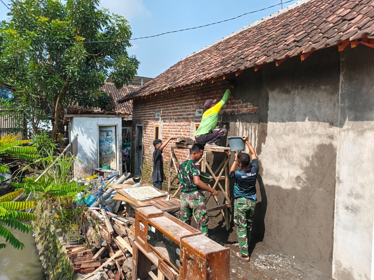 Semangat gotong royong terlihat saat anggota Satgas TNI Manunggal Membangun Desa (TMMD) Ke-127 Kodim 0819/Pasuruan bersama warga menyelesaikan tahap finishing rehabilitasi Rumah Tidak Layak Huni (RTLH) milik Ibu Aisyah di Dusun Ngepreng, Desa Wonosari, Kecamatan Gondangwetan, Kabupaten Pasuruan, Senin (9/3/2026).Prajurit TNI dan warga bekerja sama di atas perancah kayu, mengaduk semen dan meratakan plaster pada dinding bata. Perlahan, dinding rumah tampak semakin rapi dan kokoh, menjadi tanda kemajuan pembangunan rumah tersebut.