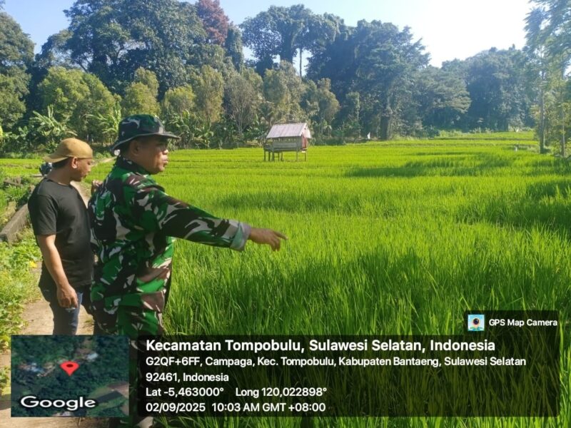 BANTAENG Teropong Barat.com, – Babinsa Kelurahan Campaga, Koramil 1410-03/Tompobulu, Serka Saharuddin, melaksanakan kegiatan komunikasi sosial (Komsos) sekaligus pendampingan kepada warga dalam pemeliharaan tanaman padi di Kampung Taruttu, Kelurahan Campaga, Kecamatan Tompobulu, Kabupaten Bantaeng. Selasa (02/09/2025)