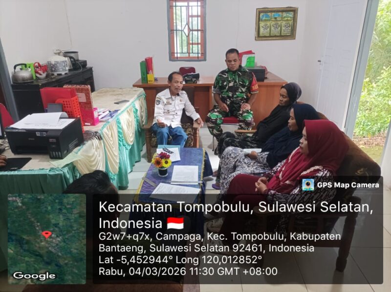 BANTAENG, Teropong Barat.com, – Babinsa Kelurahan Campaga, Koramil 1410-03/Tompobulu, Kodim 1410/Bantaeng, Sertu Saharuddin, bersama Lurah Campaga melaksanakan kegiatan Komunikasi Sosial (Komsos) dengan warga binaan. Kegiatan tersebut berlansung di Kantor Lurah Campaga, Kecamatan Tompobulu, Kabupaten Bantaeng. Rabu (04/03/2026)